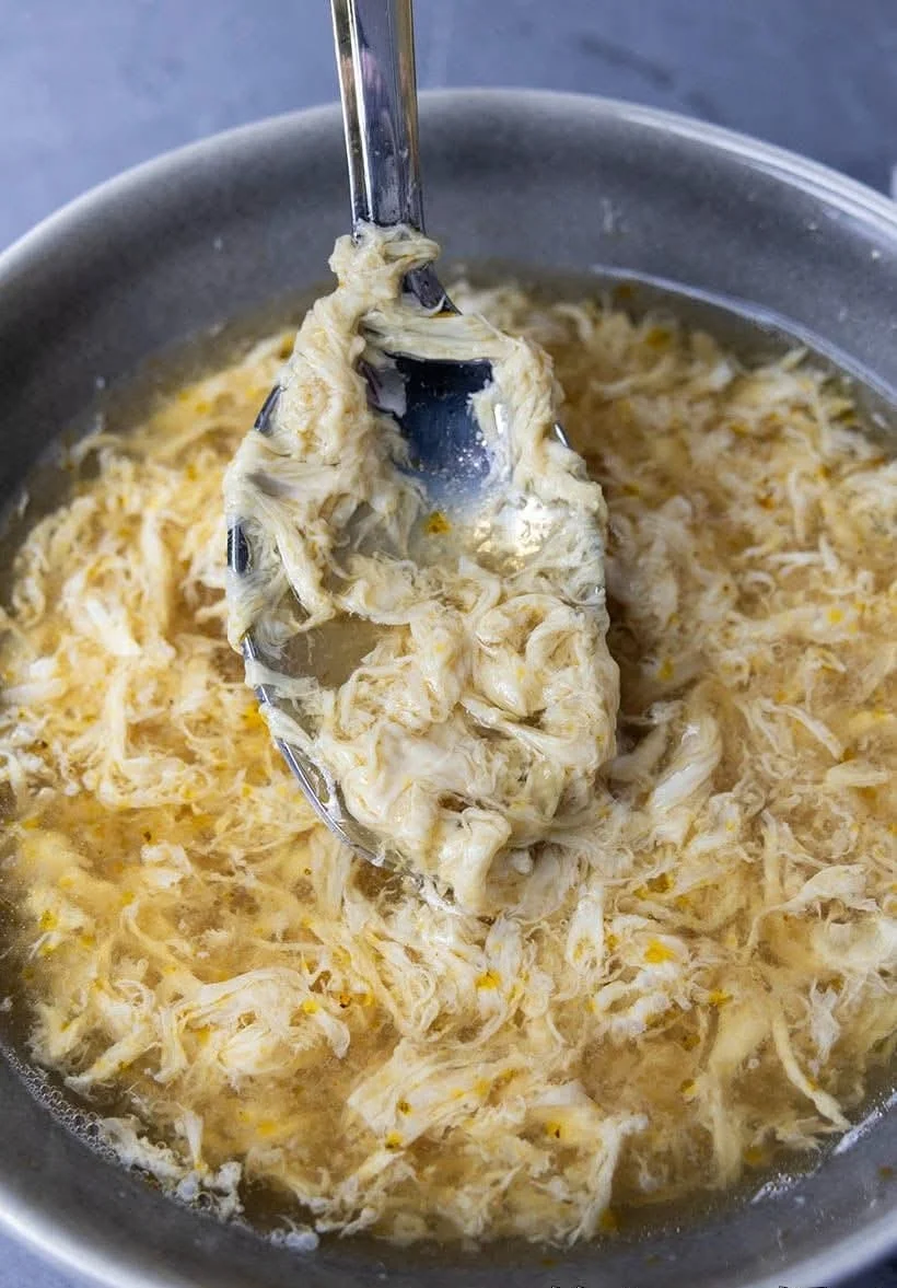 3. Slowly pour eggs into the simmering broth, stirring gently.