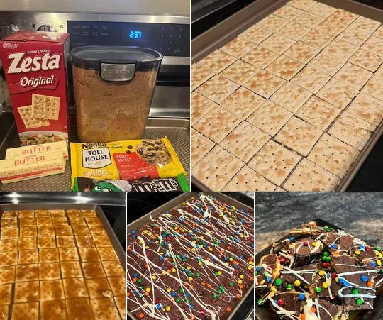 Preheat oven to 400. Take a cookie sheet and line it with saltine crackers. Melt two sticks of butter and one cup of brown sugar in a saucepan and stir until it becomes caramel consistency.