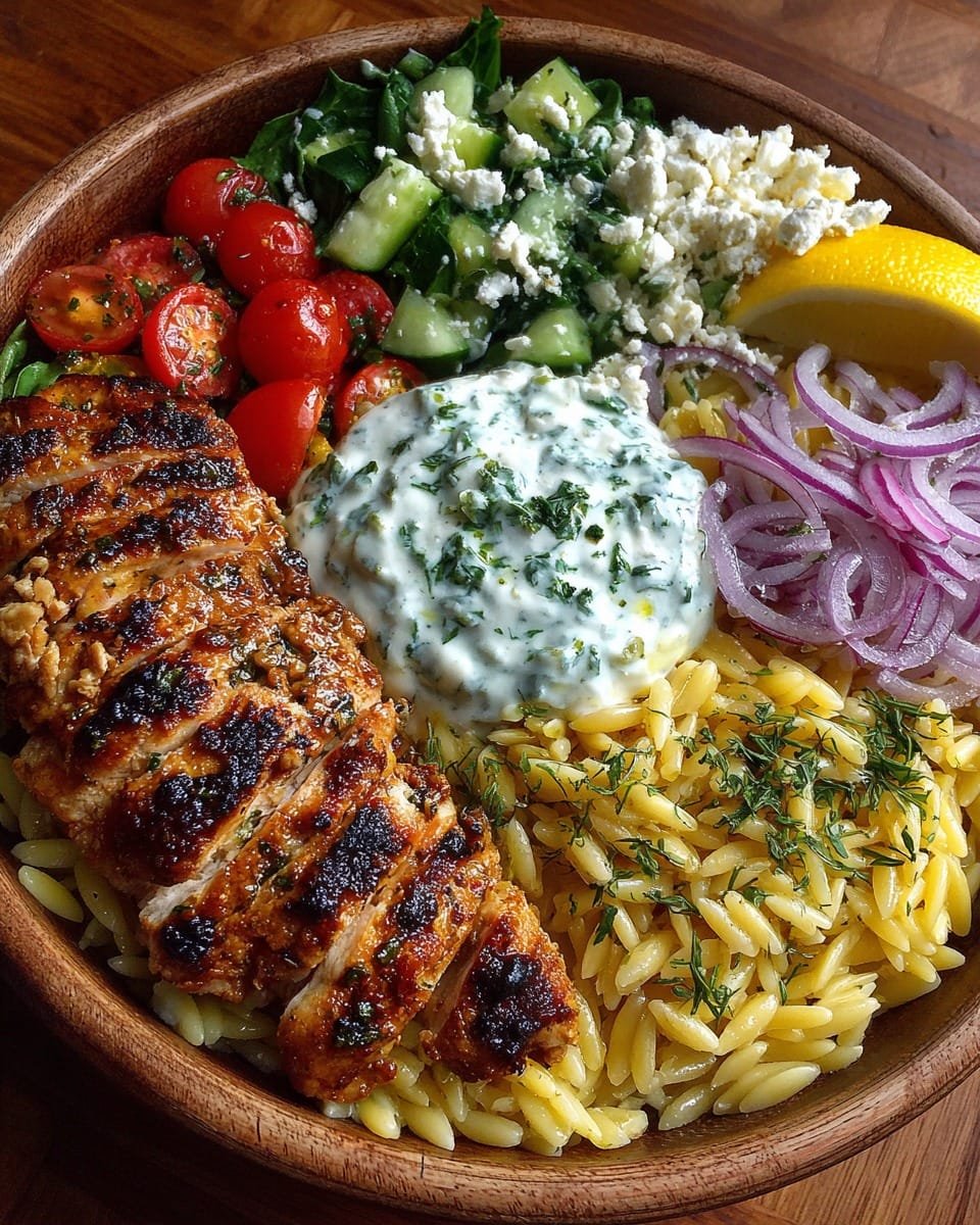 Lemon Herb Chicken Orzo Bowl with Garlic Feta Yogurt Sauce