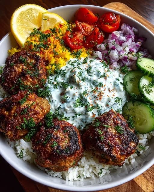 A fresh, colorful bowl packed with herby meatballs, fluffy rice, creamy tzatziki, and crisp vegetables. Perfect for meal prep or a balanced weeknight dinner.