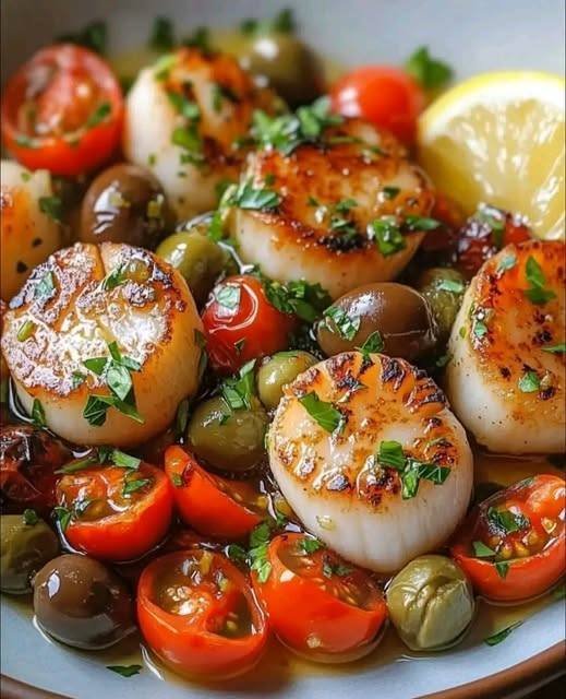 Golden seared scallops paired with juicy tomatoes, briny olives, and capers for a vibrant Mediterranean delight!